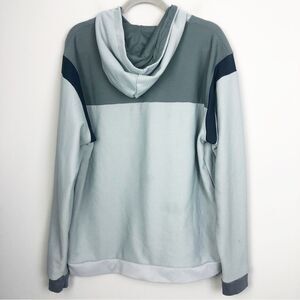Nice two tone gray hooded sweatshirt by J. America Athletics. Navy blue stripe around the arm. Georgia Tech GT on left chest and Yellow Jackets across the front. Small mark as shown but otherwise good condition! Mens (unisex) size extra large (xlarge).