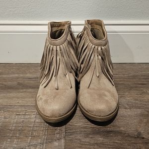 Tan faux leather ankle booties featuring matching fringe on both sides. Zipper on inner side, comfy insoles 2" heel. In excellent used condition. J. Adams, size 8.5.