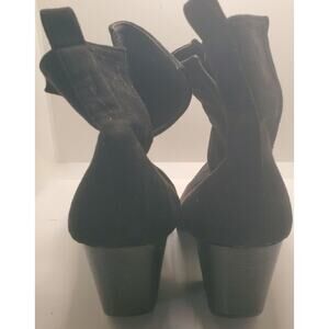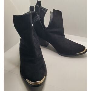 Small scuff pictured. Tried on. Never worn. Elevate your style with these J. Adams Tess Women's Black Ankle Boots. These stylish ankle boots feature a pointed toe, block heel, and a pull-on closure. The faux suede upper material and synthetic lining material provide comfort and durability, while the rubber outsole material ensures a sturdy grip. The boots are perfect for casual occasions and are a great addition to your wardrobe.