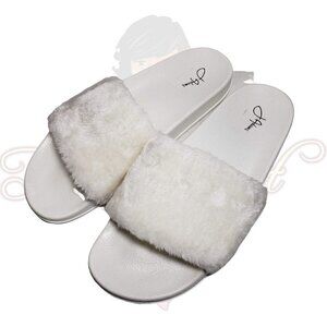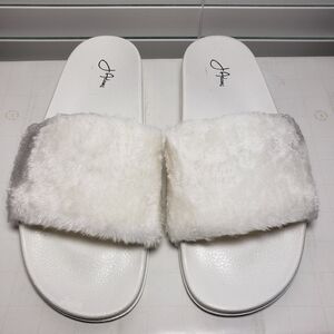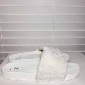 J. Adams White Open Toe Backless Fur Slide Sandals