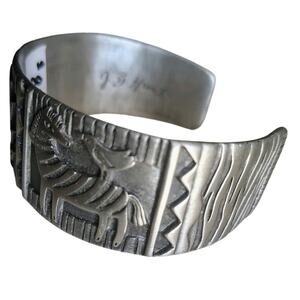J. B. Hunt Wild Kingdom Wide Cuff Bracelet Pewter Carved Elephant Zebra Bird Designer Vintage Wearable Art