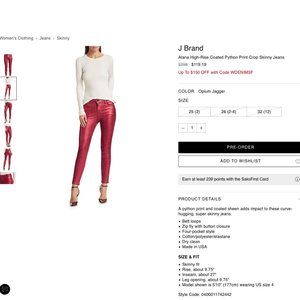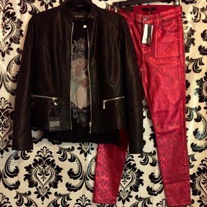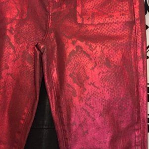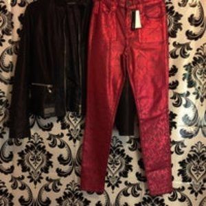 Gorgeous J Brand Cheetah print red leather jeans/pants! NWT. Retail at $298 and as much as $200 in the few places online. Top and jacket shown for an idea of how I would wear these. Perfect for a night out, dress in a T-shirt or something sparkly. Would also look great with a solid top and a statement necklace. And go for a pair of hot patent heels or booties! (**NOTE: This listing is for pants/jeans ONLY.)