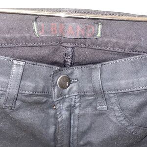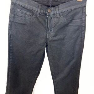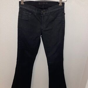 Worn once! J Brand coated wax black jean. Fitted through the leg and flare at the bottom. Front pockets sealed.