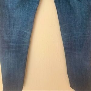 Size 25. Very good condition but they have been hemmed by a tailor. Please see measurements below and last photo. Color is “ink”. Factory fading & whiskering as designed. Some light fading at knees. Tiny distressed area on back pocket. See photo # 14. Fabric: 98% Cotton 2% Spandex. Approximate measurements (taken when laying flat- cannot guarantee fit):