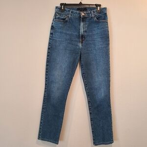 J Brand 1212 Runway High Rise Slim Straight Jeans in Pacific. The 1212 Runway high-rise jean is designed with a slim-straight leg for a flattering fit and finished with a button-and-zip fly. It’s cut from stretch denim that has the look of authentic rigid denim but is blended with plenty of stretch so you can move comfortably. They are in excellent preowned condition.