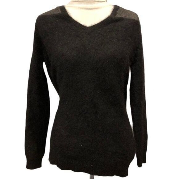This soft black J Brand angora blend V-neck sweater with metallic yoke and ribbed trim is gorgeous. Perfect with a pair of jeans or paired with leggings. It's luxurious and cozy. Perfect with leather tights.