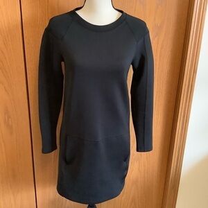 Black long sleeve scuba knit fabric shift dress. Dropped sleeves. Loose relaxed fit. Zip detailed on the cuffs. Back zip closure. Round neckline. Two front pockets. Fabric is 47% polyester, 25% cotton, 25% modal and 3% polyurethane. Approximate measurements laying flat: bust 17” across from armpit to armpit, sleeve length 20” and length 31.5”. In excellent worn condition. No stains or holes.