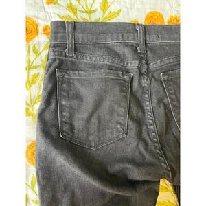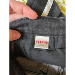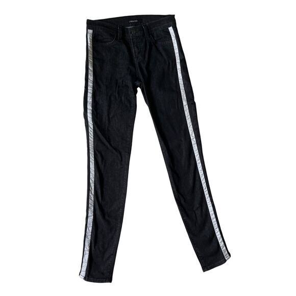 Designer J Brand skinny jeans in sleek black with a sporty white side tuxedo stripe—premium, flattering, and in excellent pre-owned condition. Size 26, stretchy and comfortable with polished details. Ideal for elevating casual or evening looks. Machine wash inside out, cold; hang dry to preserve the fabric and stripe.