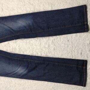 J Brand Women's Blue Dark Vintage Wash Five Pocket Button Zipper Front Closure Mid Rise Straight Leg Jeans. 92% Cotton, 7% Polyester, 1% Elastane. Whiskering/Fading. Measurements approx. Flat Lay. Waist: 13.5, Rise: 8, Hips: 16, Inseam: 31. Size 26
