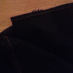 J Brand black boot cut style jeans, size 27. Hardly worn, great condition. Black denim with mustard stitching. Boot cut style is looser in the lower leg but still fitted up top. Full disclosure, there is very slight fraying along bottom seam on left leg (see photo).