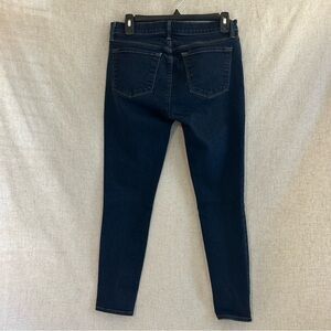 Dark blue wash capri jeans with a comfortable stretch. Made from a cotton blend. Features front and back pockets. Approximate flat measurements are shown in the pictures.