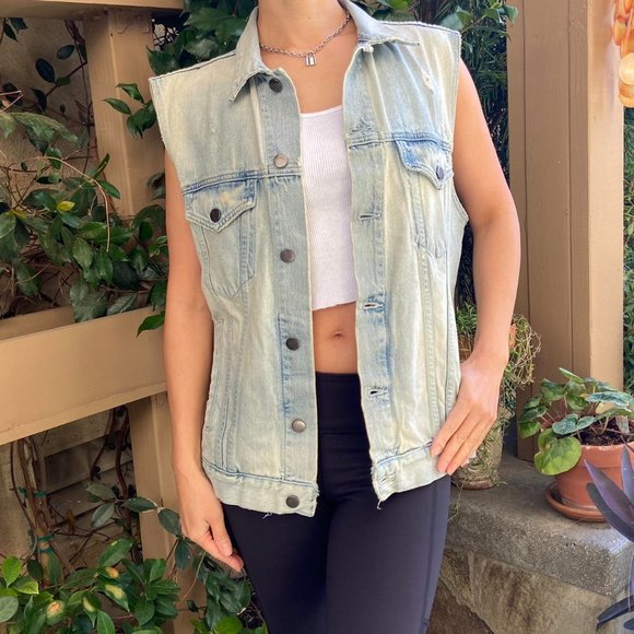 J Brand Destructed Worn Down Denim Vest With Light Blue Fade Wash & Distressed detailing.