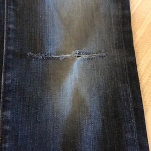 J Brand skinny jeans. Dark blue wash. Faded in front. Ripped knee. 28” inseam. LB.