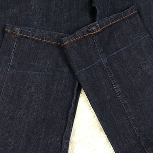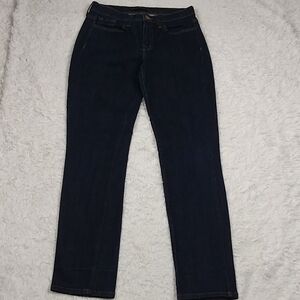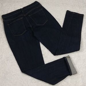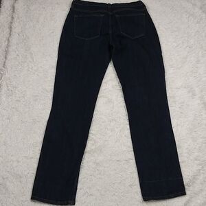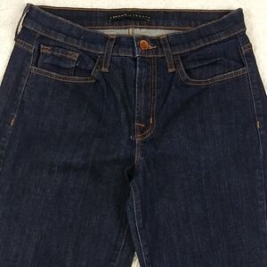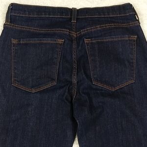 J Brand For Theory Georgia Philosophy Women's Five Pocket Mid Rise Dark Wash Straight Leg Ankle Blue Jeans. 92% Cotton, 6% Elastomultiester, 2% Elastane. Button/Zipper Front Closure. Cuff Crease Right Leg. Small Snag At Zipper. Measurements approx. Flat Lay.