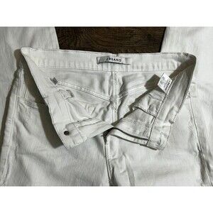 The J Brand Women's 27 White Denim Capri Mid Rise Straight Stretch Jeans with a Frayed Hem are a stylish and versatile wardrobe staple. These regular fit jeans feature a solid white color and a comfortable mid-rise waist. Made from denim fabric with a light wash and added stretch, these jeans are perfect for all seasons. The 5-pocket design with a button closure adds to the classic denim look, while the frayed hem adds a trendy touch. Perfect for outdoor activities or casual everyday wear, these jeans combine comfort and style effortlessly.