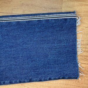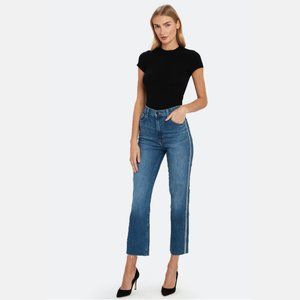 Add some bling to your wardrobe with these stunning J Brand jeans featuring a white and navy stripe with rhinestone accents down the side of both legs and a raw hem. Fit is true to size.