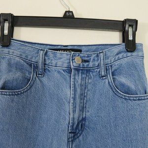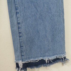 Stylish light blue jeans. Features frayed hem. Perfect for casual wear.