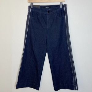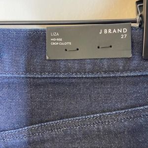 J Brand Liza mid-rise crop culottes, size 27. Dark stretch denim with side stripe detail. Culottes are cropped length, and have a wide leg. Brand new with tags.