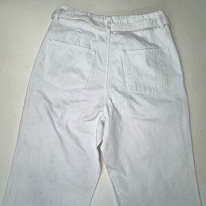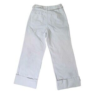 J Brand Louisa High Rise Tie Waist Pants in white. These classic denim jeans feature a wide leg, extra high rise, tie belt, pleated front zip and button closure, 4 pocket design, and extra waist button to make them slightly adjustable. Women's size 28, measurements pictured. Good to fair used condition - final 3 photos show multiple faint dark marks to front pant legs.