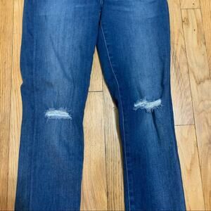 J Brand Mama J side panel destructed jeans. Functional front zipper and button closure with stretchy panels. Premium denim with factory distressing on seams and holes in knees. Minor wear from use, overall good condition!