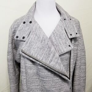 J Brand designer oversized Pallenberg moto jacket. Cotton wool blend knit in a heathered light gray. Front asymmetrical zipper. Gunmetal hardware. Collared. Dark gray satin lining. Excellent quality with a good weight to it.