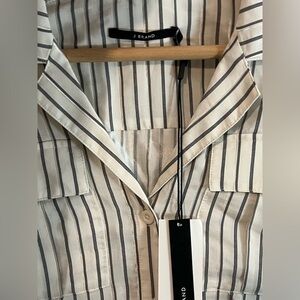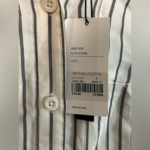J Brand, satin stripe, utility shirt, lace up back, striped blouse, button down, viscose blend, ivory top, long sleeve shirt, workwear chic, elevated basics, polished style, fall fashion, new with tags, wardrobe staple