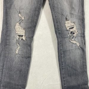 Features: gray denim jeans, zipper and button fly, 5 pockets, mid rise, distressed knees, skinny fit, slit at the hems for added movement