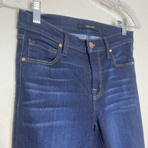 Great pair of jeans by J Brand. Skinny fit with a darker blue wash. 5 pockets and a button fly zip. Has stretch. Perfect closet staple! All measurements are approximate, taken flat and closed.