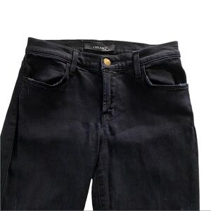 J Brand “Super Skinny Blackout” Black Wash Denim Mid-Rise Distressed Destroyed Raw Hemmed Women’s Jeans Size 27 with an Inseam of 30”. These jeans are new without tags. The perket is still attached to the inside label.