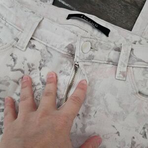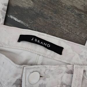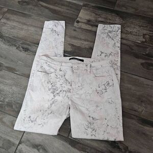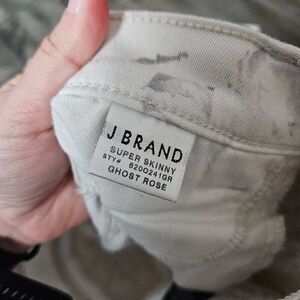 This is a pair of Super Skinny jeans by J Brand. The color name is Ghost Rose. These jeans are white with muted pink and grey Rose print.