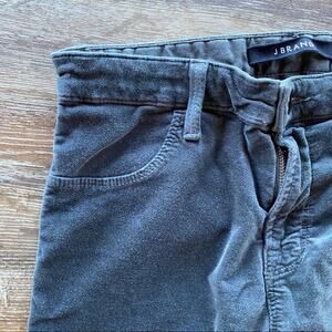 J Brand velvet mid-rise super skinny pants in Asphalt color, size 27. Dark grey velour, works for the office or for date night! Zip fly with single button closure. Faux hip pockets. Two rear pockets. Skinny leg. Belt loops.