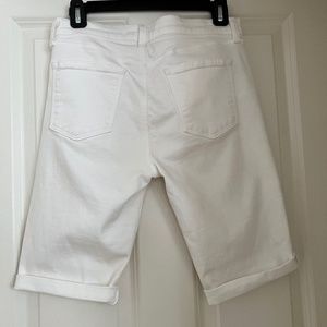 These cute rolled cuff size 28 white jean shorts have a 9" rise, a 10.5 inseam with the cuff, and a 14" leg opening. The material is very stretchy and comfortable. I also have the same pair to sell in a size 27. I gained weight so no longer can wear them.