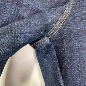 XFit Lycra four way stretch dark wash blue denim skinny jeans. Button closure, belt loops, polyester and cotton blend denim. Indigo wash.