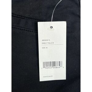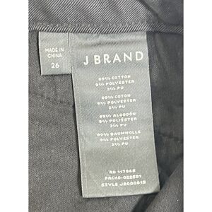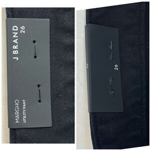 Elevate your hiking game with these J Brand Margho utility cargo pants. The high-rise, straight leg design features a zip and button closure, flat front, and hem with zipper Capri length, accents for a touch of edge. The solid black cotton blend material is machine washable, making them perfect for casual wear and outdoor adventures. Plus, the spacious cargo pockets offer ample storage for all your essentials. Available in size 26, these pants are ideal for women who want to combine practicality with style.