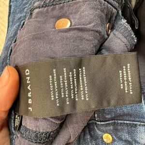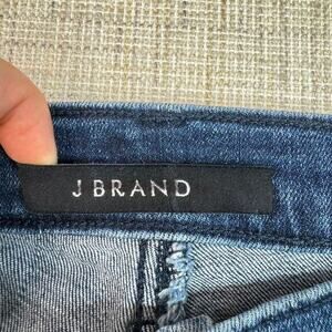 J Brand's Skinny Jeans offer a sleek fit with a mid-rise design and button pocket detail. The blue denim is crafted from a comfortable cotton-elastane blend, featuring a zip fly with button closure for a smooth silhouette.