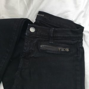 Size 25 black jeans by J Brand with denim details by hips! Black is a little worn, I wore these quite a few times about 3 years ago! They're pretty comfortable :)