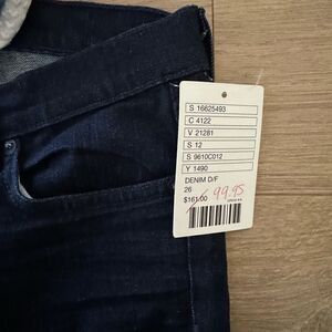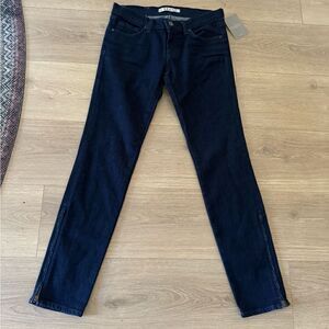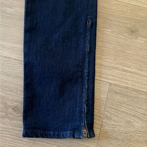 Size 26 new with anthropologie tags. Size 26. Dark wash and with a zipper detail at ankle.