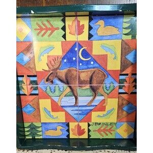 J. Brinley Art Tile in a Wooden Serving Tray Moose Scene (read)