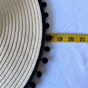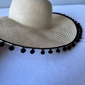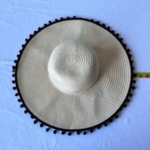 * Features: woven, straw wide brim sun hat with black pom pom trim