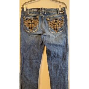 J & COMPANY BEVERLY LOW RISE BOOTCUT EMBROIDERED Y2K DENIM JEANS WOMEN SIZE 29. FIVE POCKET, HAS A EMBROIDERED CROSS ON BACK POCKETS, 99% COTTON 1% LYCRA, MADE IN USA. RISE 8. INSEAM 30. LENGTH 39.
