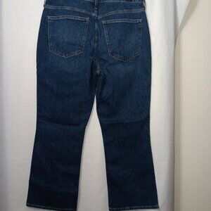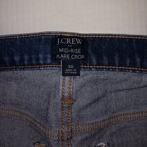 Size 30 - Women's J.Crew Mid Rise Flare Crop Jeans has button fly and functional pockets in a blue denim color. The material is 99% cotton and 1% lycra in gently used preowned condition