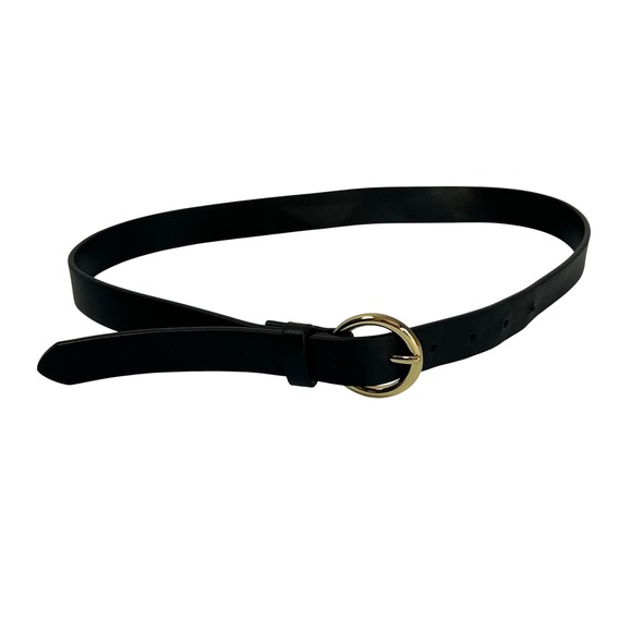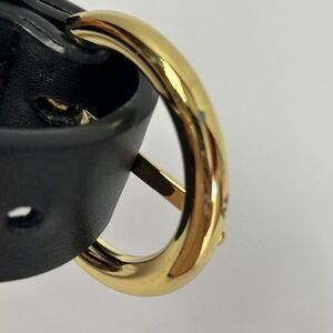 A black leather belt with a classic gold-tone buckle. This belt features a single prong for closure and multiple holes for adjustable sizing. The leather has a smooth finish and shows some minor signs of wear consistent with use. The buckle is round and polished, adding a touch of elegance to the design.