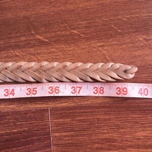 Elevate your style with this chic braided tan leather belt. Perfect for adding a touch of elegance to any outfit.