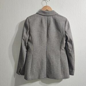 Yellow and blue checked single button blazer with notched lapel. Buttoned cuffs and welt pockets. Wool blend. Lined. Size 4. New with tags.