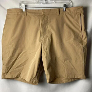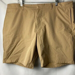 J CREW FACTORY MENS SIZE 40, 9” INSEAM TAN SNAP ZIP FRONT CLOSE POCKETS CLEAN. ATHLETIC DRI FIT FEEL 100% POLYESTER EXCELLENT CONDITION