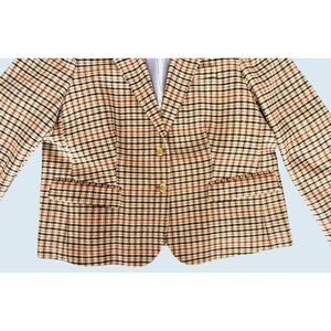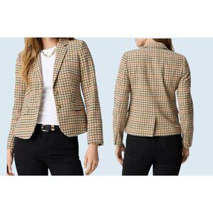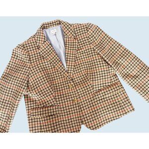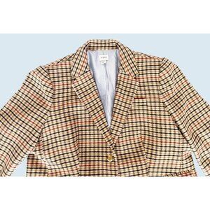 Great blazer by J Crew. Tan with multi color plaid / herringbone print. Notch collar with felt under collar. Button closure. Faux pockets. Functional cuff buttons. Striped contrast print interior lining. Wool blend. Size 18. Pre-owned and gently worn in really nice condition!