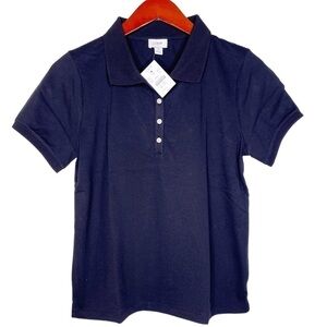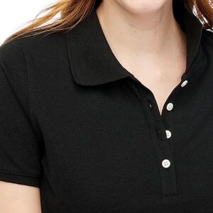 Brand New Pique Polo Top from J. Crew Factory. This Top features a relaxed fit with a button collar neckline. Pique fabric construction made from a Cotton, Poly, Elastane blend. Solid Black, Machine Wash