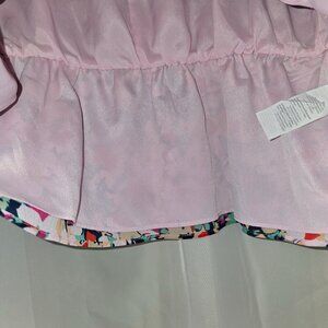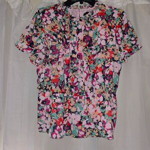 Pink floral printed chiffon (100% Polyester). Top. Short sleeves. High neckline. 23" from shoulder to hemline. Imported.