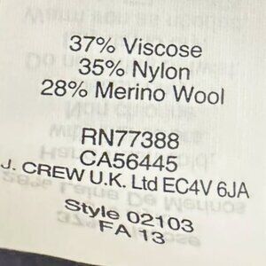 37% Viscose/ 35% Nylon/ 28% Merino Wool. (Picture showing material and care instructions is from the web. Actual tag from sweater was removed. )