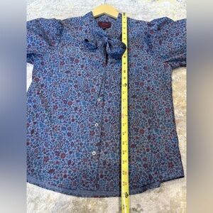 J. Crew and Liberty London Art Fabrics Tie Neck Blouse In Liberty Colombo Chambray. Blue Floral Multicolor. Gorgeous button down shirt with 3/4 sleeves and front bow. Unique color combination, so pretty! Like new condition.